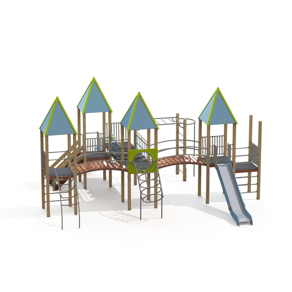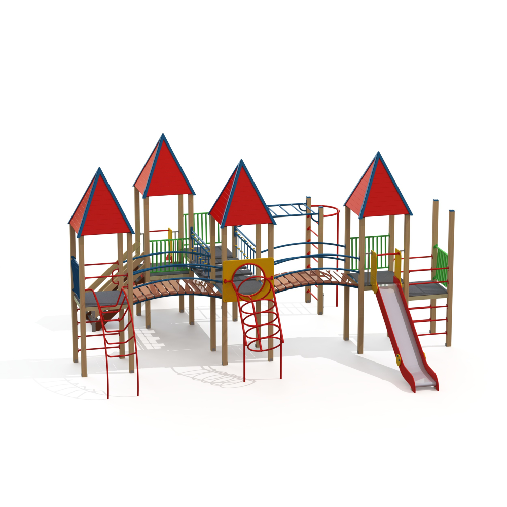 На первой башне установлена крыша, лестница, горка. На второй башне (полубашня) установлены ограждение металлическое, ручки вспомогательные и она имеет продолжение в гимнастический комплекс с шестом спиралью. Вторая башня соединена с третьей подвесным качающимся мостом. На третьей башне установлена крыша, спираль и ограждение фанерное с круглым лазом. Третья башня соединена с четвертой и пятой башнями радиусными мостами с металлическими перилами. На четвертой башне установлены крыша, шест, лиана, ручки вспомогательные и металлическое ограждение. На пятой башне установлена крыша, горка, металлическое ограждение и перекладина. На шестой башне (полубашня) установлены металлическое ограждение и шведские стенки.