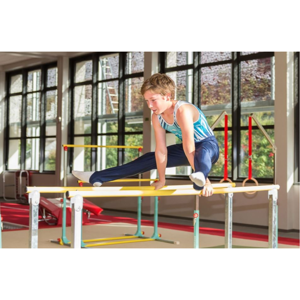 Предназначены для первых занятий по гимнастике с отработкой самыми юными гимнастами стоек и висов. Эти брусья легко разбираются и транспортируются. Они состоят из отдельных модулей. Расстояние между жердями быстро регулируется в диапазоне от 0,25 м до 1,30 м, а высота — от 0,90 м до 1,40 м.