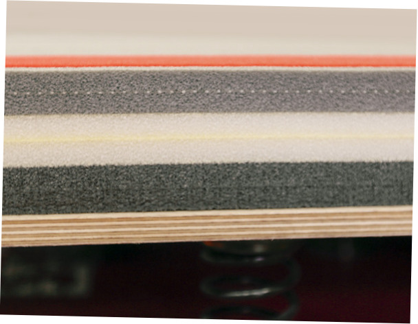 Специальные пластины из многослойной фанеры укладываются на динамические пружины. Соединение пластин осуществляется с помощью соединительных профилей и замковых элементов, обеспечивающих оптимальную равномерность поверхности. За счет толщины 12 мм и конструкции (9 слоев) обеспечивается гибкость и прочность.