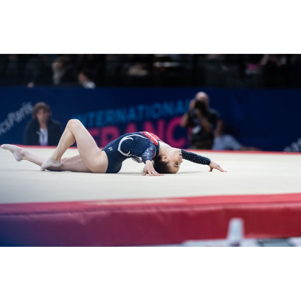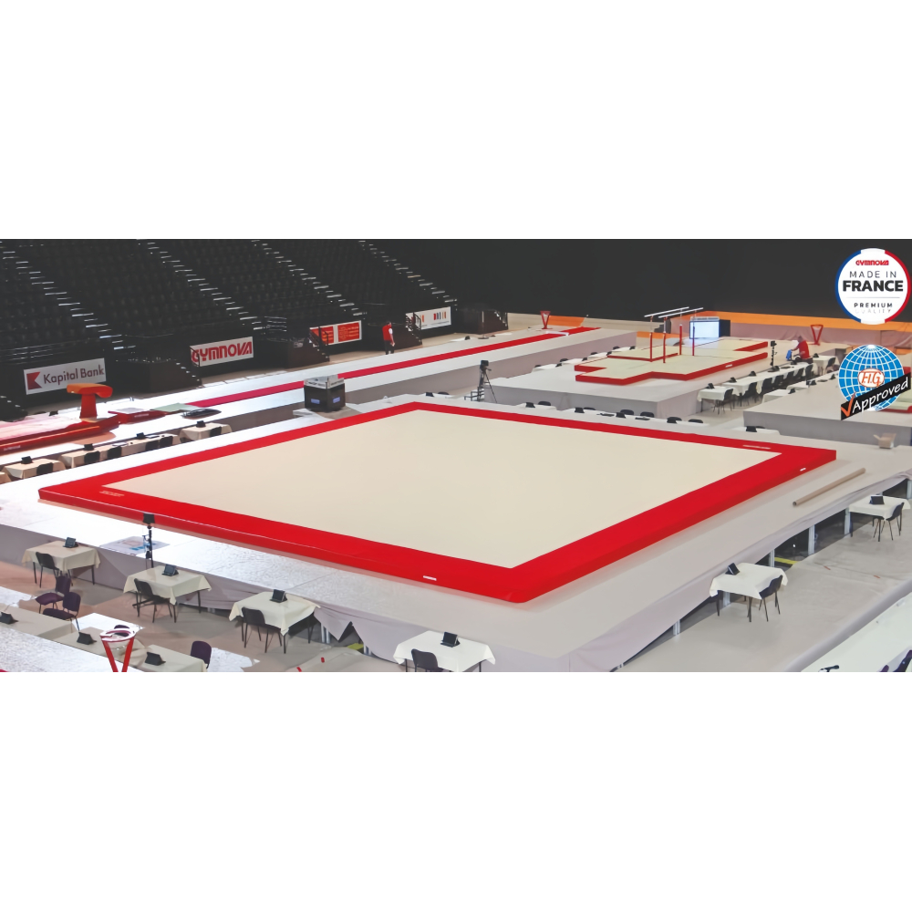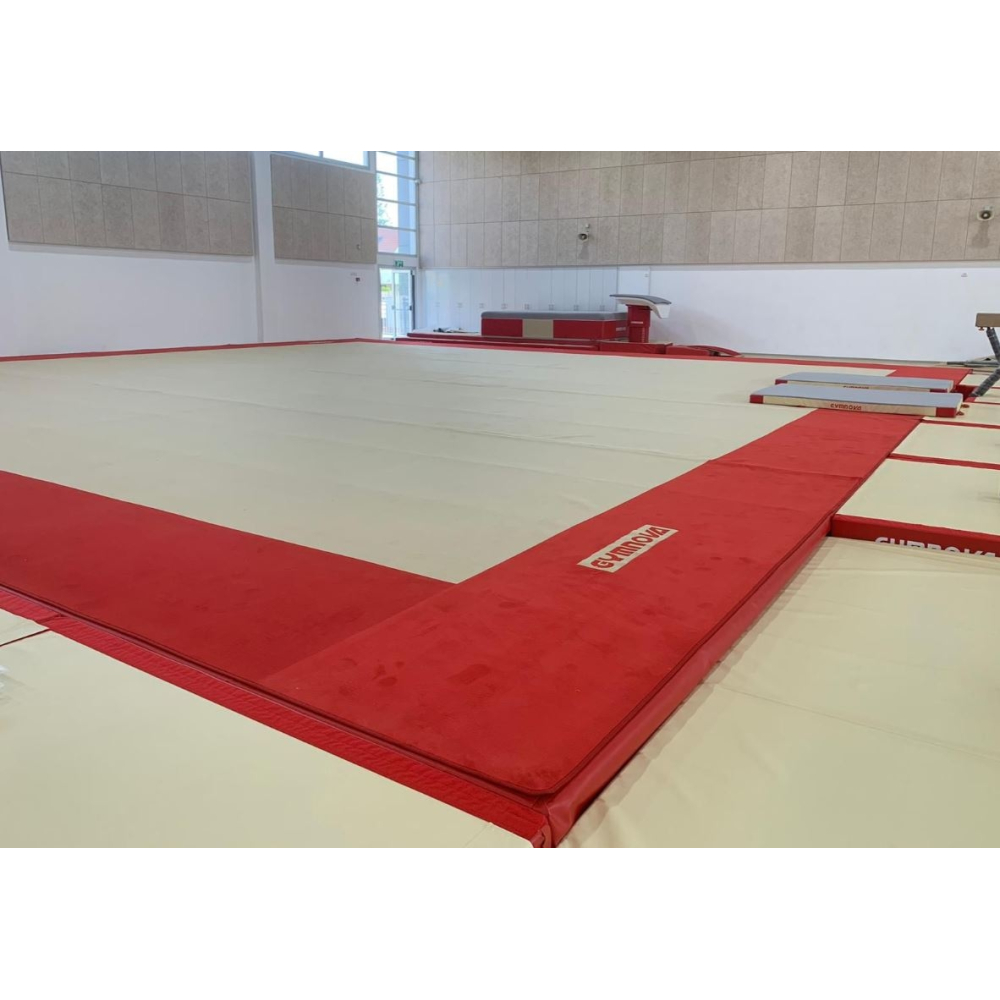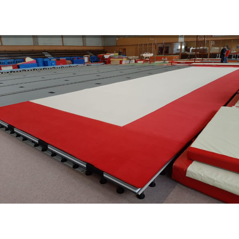 Состоит из полотен, соединенных между собой лентами-липучками, расположенными на внутренней стороне ковролина. Разметка FIG выполнена с использованием контрастной окантовки, а отделка по краям обработана оверлочным швом. Толщина покрытия и основа высокой плотности отвечают за удобство использования. Встроенная противоскользящая система предотвращает смещение ковролина во время его использования. Гимнастическая поверхность: 12 × 12 м.