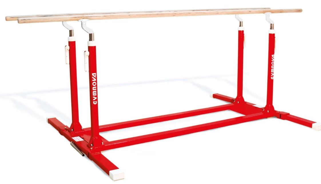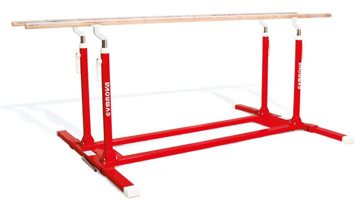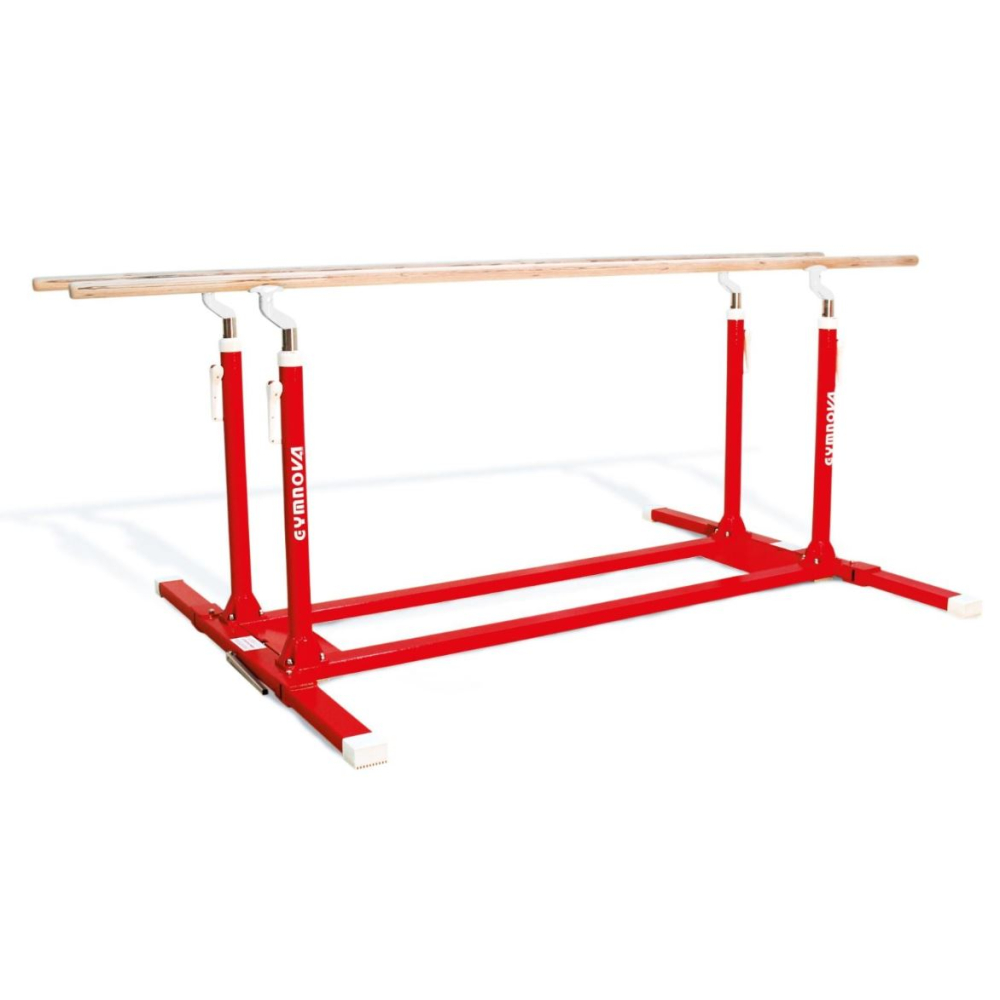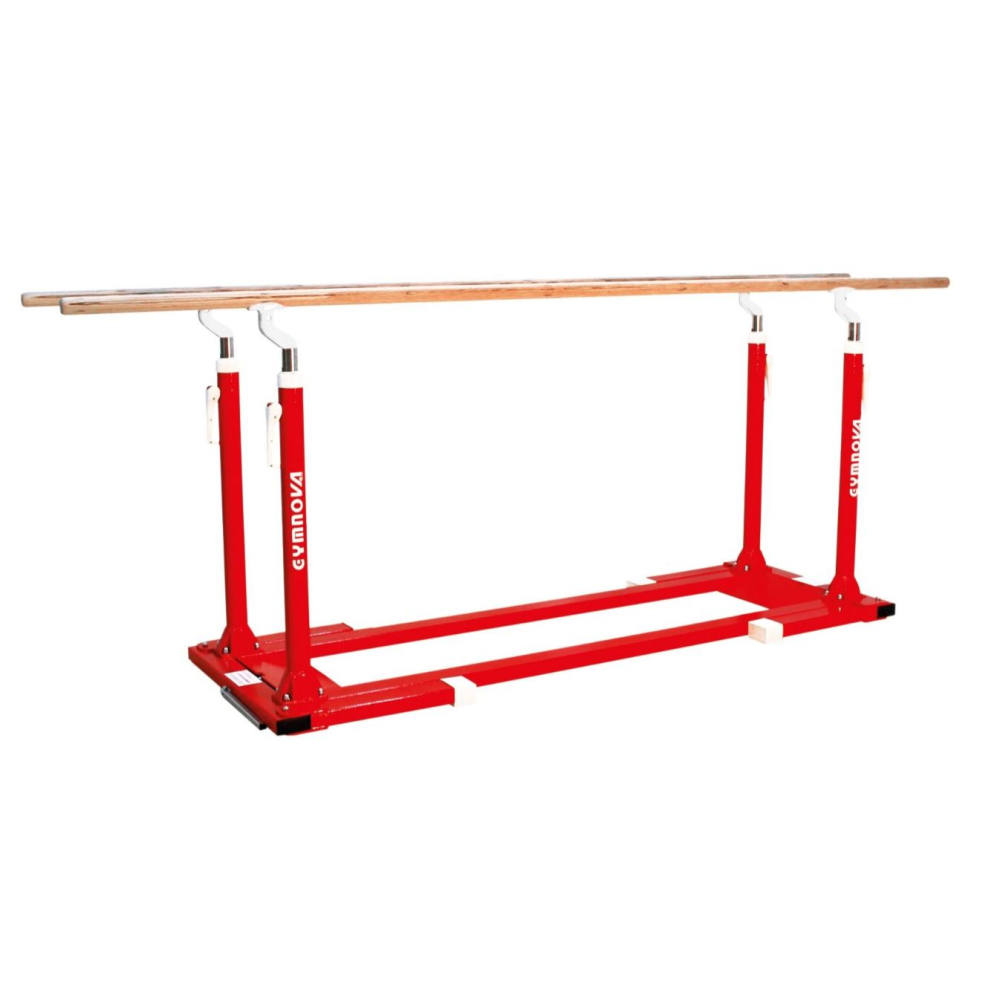 Параллельные брусья для тренировок могут быть исполнены в нескольких вариантах (со складными и нескладными ножками). Они оснащены зажимным рычагом с эксцентриком для регулировки и жердями из многослойной фанеры длиной 3,50 м. Регулировка высоты выполняется от 1,40 м до 2 м. Расстояние между жердями регулируется от 37,5 см до 65 см с помощью детали из композитного материала. Ножки с противоскользящими накладками.