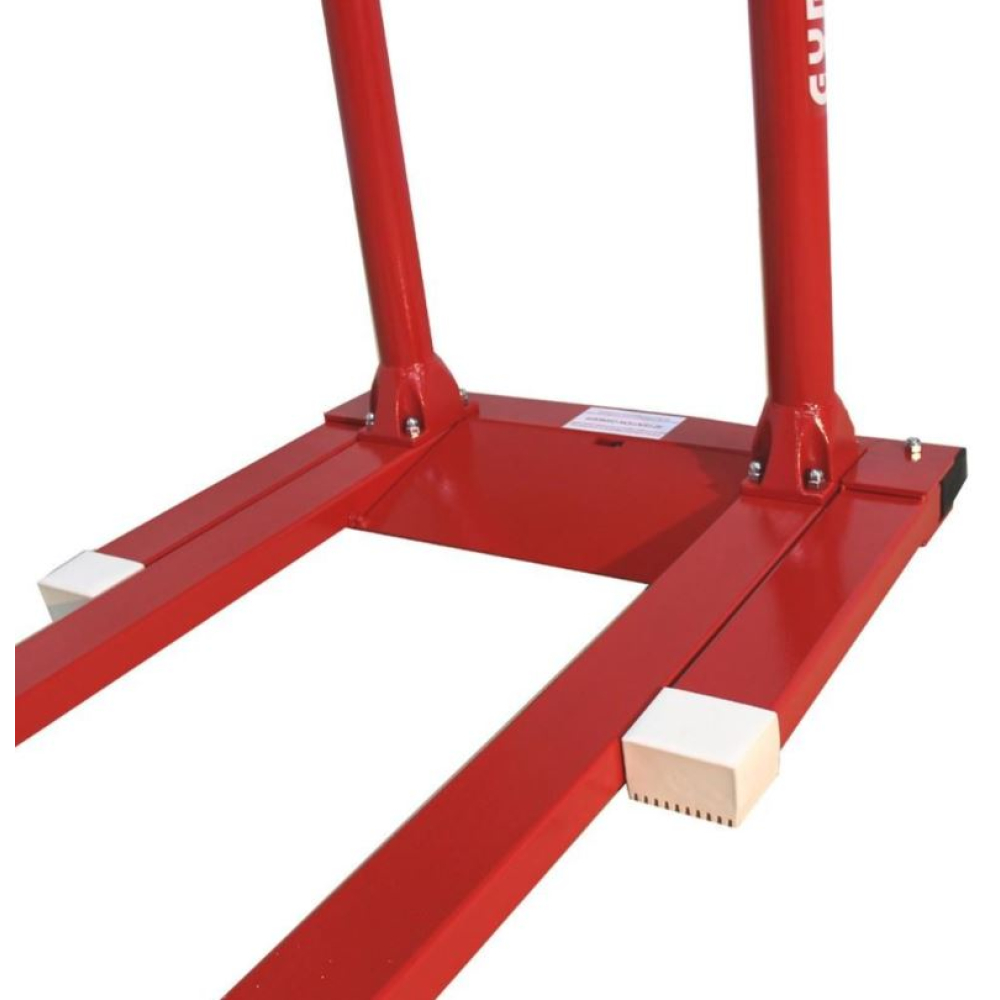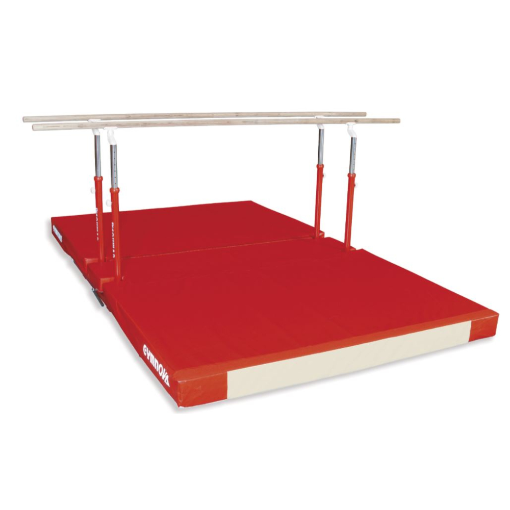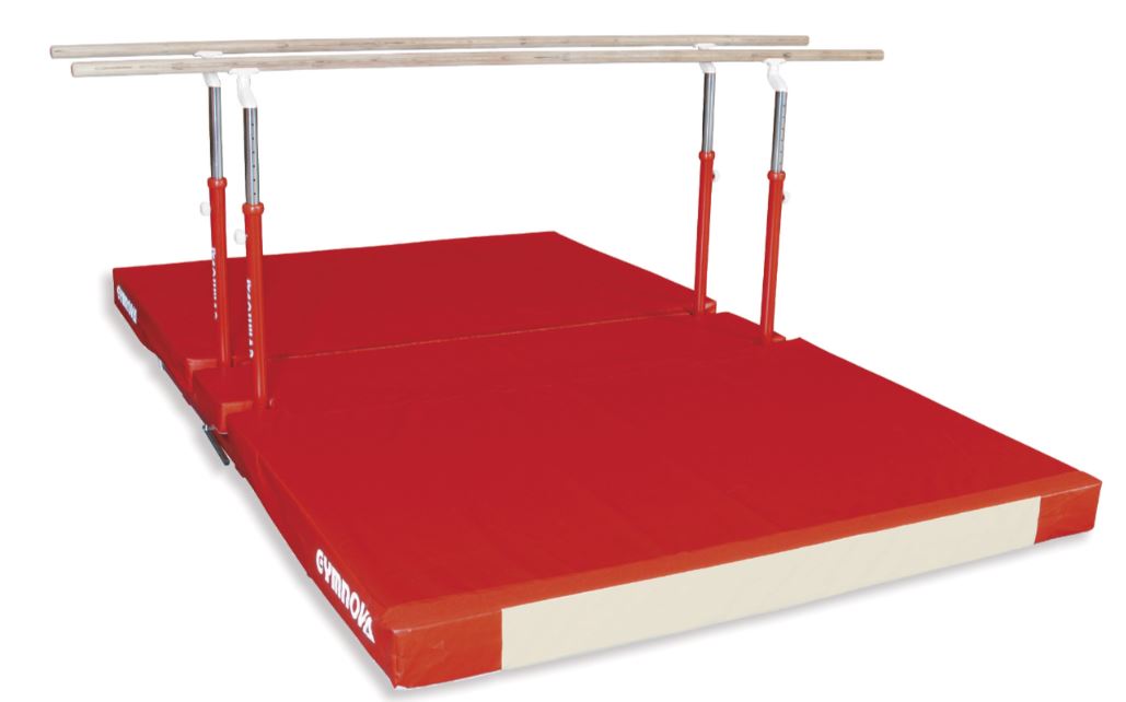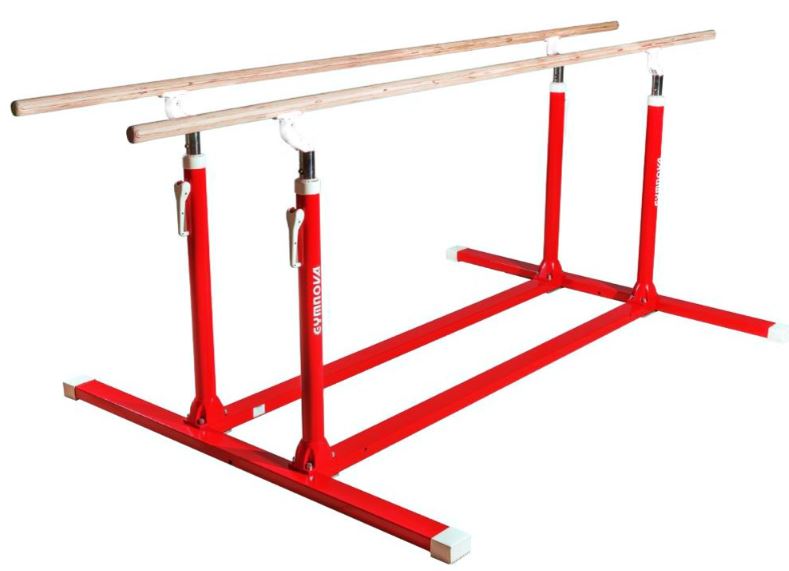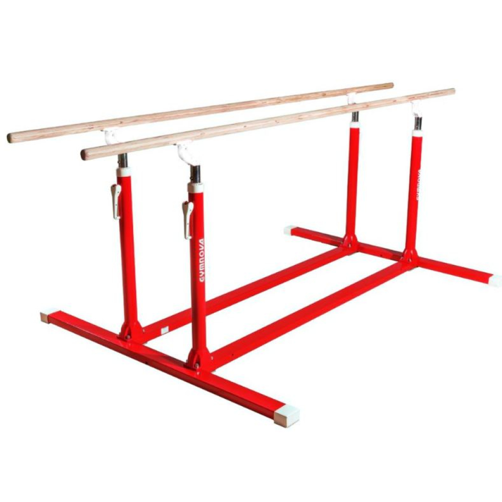 Параллельные брусья для тренировок могут быть исполнены в нескольких вариантах (со складными и нескладными ножками). Они оснащены зажимным рычагом с эксцентриком для регулировки и жердями из многослойной фанеры длиной 3,50 м. Регулировка высоты выполняется от 1,40 м до 2 м. Расстояние между жердями регулируется от 37,5 см до 65 см с помощью детали из композитного материала. Ножки с противоскользящими накладками.