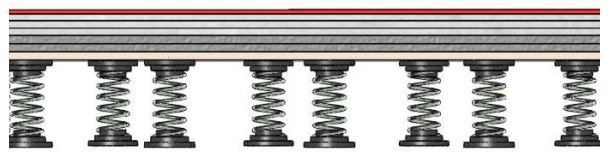 За счет установки 2424 пружин и их упругим свойствам достигается максимальная эластичность во время отталкивания. Расположение пружин в стратегических точках и гибкость специально отобранной фанеры способствуют оптимальной динамичности и равномерности во время приземления. Толщина настила составляет 14 мм.