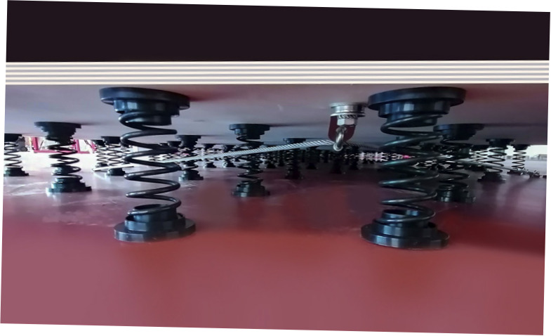 Под настилом расположено 2880 пружин высотой 125 мм, которые обеспечивают равномерную упругость при отталкивании и оптимальную амортизацию. Амплитуда деформации пружин увеличена, чтобы рабочий толчок гимнаста стал более эффективным. Отделка краев окантовкой из ПВХ.