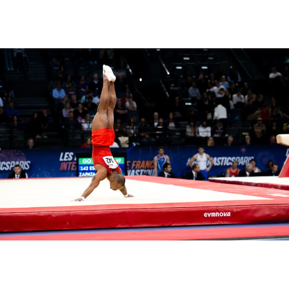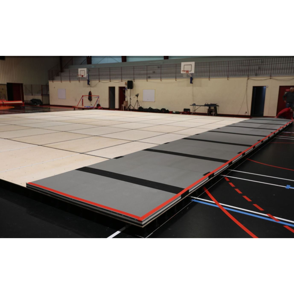 Состоит из полотен, соединенных между собой лентами-липучками, расположенными на внутренней стороне ковролина. Разметка FIG выполнена с использованием контрастной окантовки, а отделка по краям обработана оверлочным швом. Толщина покрытия и основа высокой плотности отвечают за удобство использования. Встроенная противоскользящая система предотвращает смещение ковролина во время его использования. Гимнастическая поверхность: 12 × 12 м.
