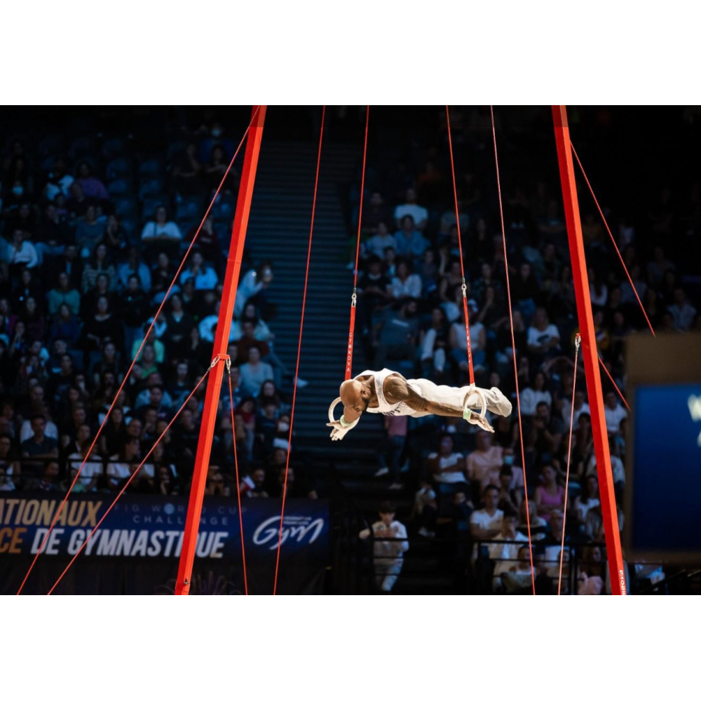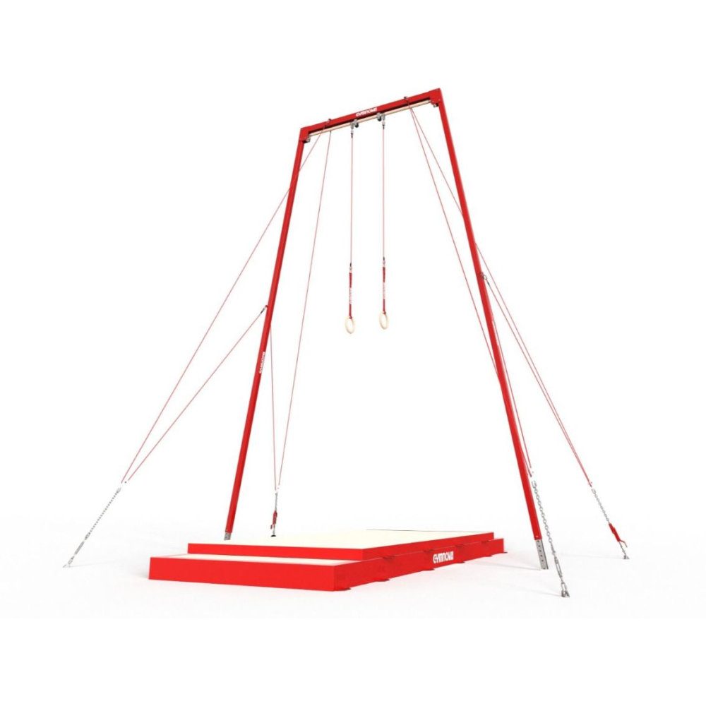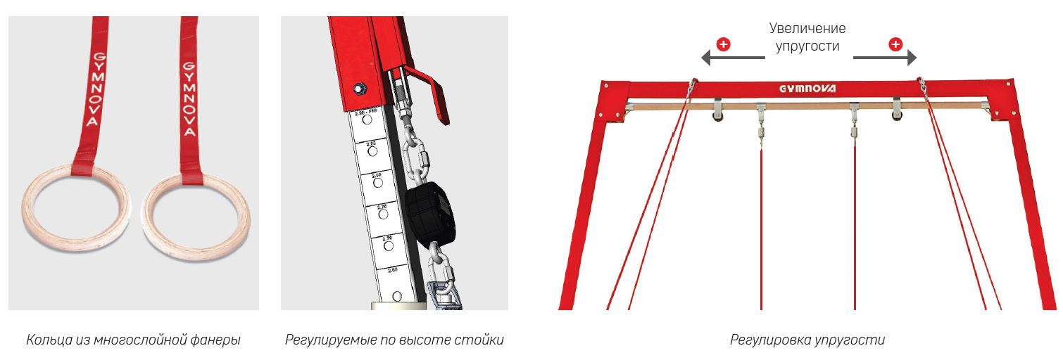 Соревновательная рама для колец позволяет гимнастам выполнять высококачественные упражнения благодаря двойным ребрам жёсткости, предотвращающим нежелательные движения. Поворотные штифты также позволяют кольцам вращаться самостоятельно, обеспечивая плавные движения. Наконец, ремень пришит и крепится непосредственно к кольцу, предотвращая его вращение.
